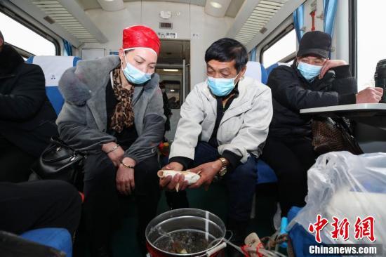 1月17日是2022年春运首日,在贵州省铜仁市玉屏县开往贵阳市的5639次普速列车上,沿线16个站点的山区民众选择乘坐5639次列车前往县城和市区赶集买卖、走亲探友。图为在玉屏县开往贵阳市的5639次列车上,一位旅客在购买农户(右)的稻花鱼。瞿宏伦 摄