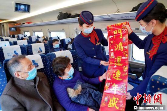 1月17日,中国铁路武汉局集团公司襄阳客运段联合襄阳铁路公安处在G6818次列车上开展“列车送福迎春运,温暖旅客回家路”活动。连日来,湖北铁路部门组织书画家走进高铁车厢现场挥毫泼墨,书写吉祥春联、福字,免费赠送给旅客。与此同时,列车乘务员还同乘警一起向旅客进行防电信诈骗、疫情防控、安全乘车注意事项等系列安全知识宣传。图为乘务员给旅客送春联。李强 摄