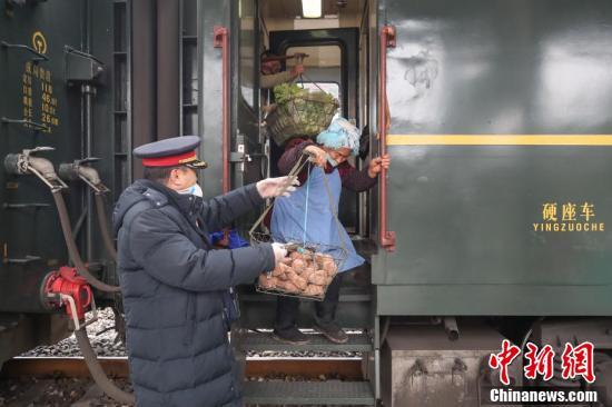 1月17日是2022年春运首日,在贵州省铜仁市玉屏县开往贵阳市的5639次普速列车上,沿线16个站点的山区民众选择乘坐5639次列车前往县城和市区赶集买卖、走亲探友。图为贵州凯里火车站,列车员帮助到站农户下车。瞿宏伦 摄