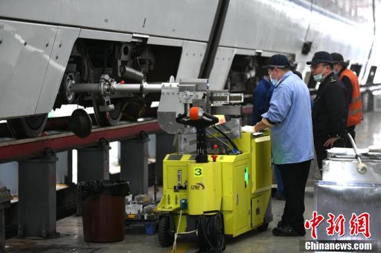1月17日,2022年春运首日,中国铁路南昌局集团有限公司福州动车段通过严防疫+“黑科技”,让动车组健康上线,确保春运安全。图为工作人员对动车进行检修保养。王东明 摄