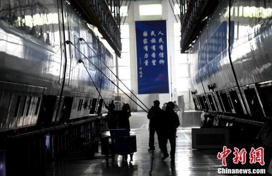 1月17日,广东省广州市,D4545次列车停靠在广州站内。1月17日5点36分,广东春运首日首趟列车D4545次(广州—成都东)从广州站驶出,将于当日14点22分抵达成都东。 中新社记者 陈骥旻 摄