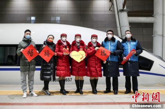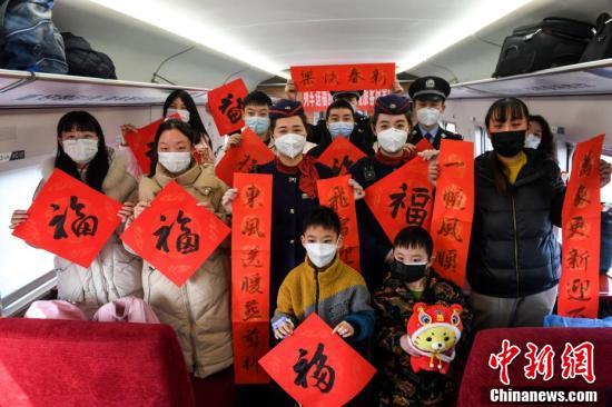 1月17日,中国铁路武汉局集团公司襄阳客运段联合襄阳铁路公安处在G6818次列车上开展“列车送福迎春运,温暖旅客回家路”活动。连日来,湖北铁路部门组织书画家走进高铁车厢现场挥毫泼墨,书写吉祥春联、福字,免费赠送给旅客。与此同时,列车乘务员还同乘警一起向旅客进行防电信诈骗、疫情防控、安全乘车注意事项等系列安全知识宣传。图为乘务员与与旅客合影留念。施勇 摄