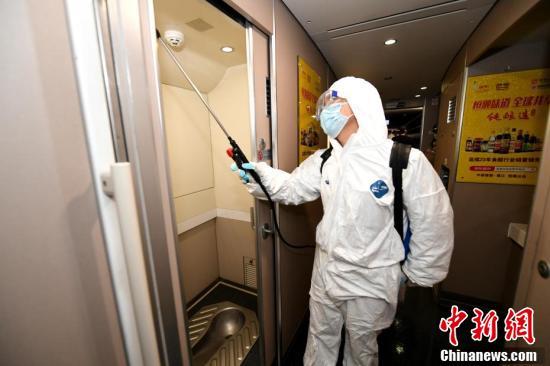 1月17日,2022年春运首日,中国铁路南昌局集团有限公司福州动车段通过严防疫+“黑科技”,让动车组健康上线,确保春运安全。图为工作人员对动车进行防疫消杀。王东明 摄