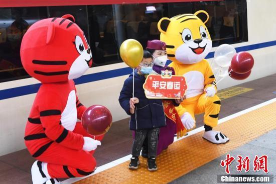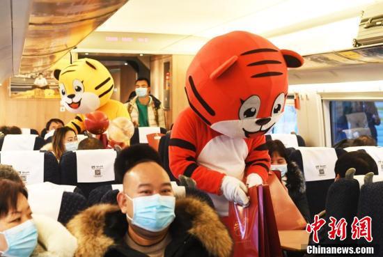 1月17日,列车乘务员扮虎为旅客送上春运礼物。当日,2022年春运拉开序幕,中国铁路成都局集团有限公司重庆客运段、重庆铁路公安处联合在重庆火车北站围绕“平安春运、有序春运、温馨春运,让旅客体验更美好”主题,开展了系列春运活动。陈超 摄