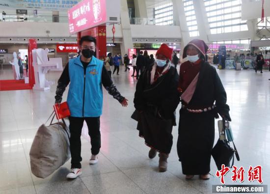 1月17日,青海省西宁市西宁火车站内,志愿者帮藏族旅客提行李并引导候车。当日,2022年春运拉开序幕,2月25日结束,共40天。中新社记者 马铭言 摄