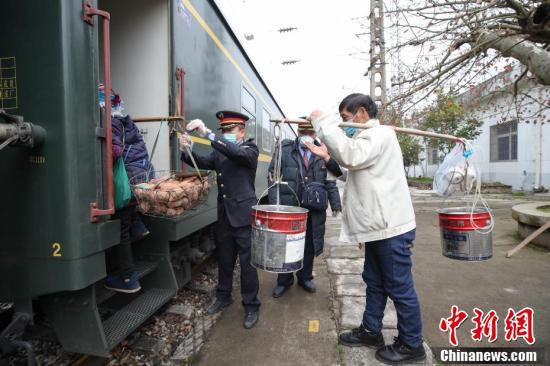 1月17日是2022年春运首日,在贵州省铜仁市玉屏县开往贵阳市的5639次普速列车上,沿线16个站点的山区民众选择乘坐5639次列车前往县城和市区赶集买卖、走亲探友。图为农户挑着蔬菜和稻花鱼在加劳站排队上车,准备去凯里市区销售。瞿宏伦 摄