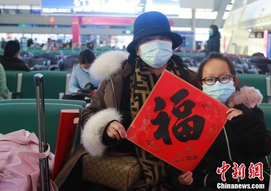 1月17日,旅客展示“福”字迎新春。当日,2022年春运拉开序幕,2月25日结束,共40天。中新社记者 马铭言 摄