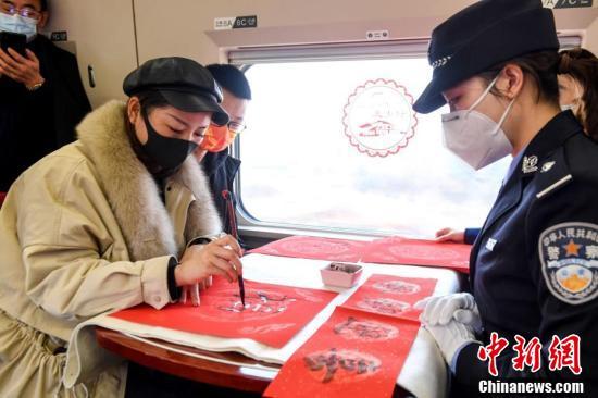 1月17日,中国铁路武汉局集团公司襄阳客运段联合襄阳铁路公安处在G6818次列车上开展“列车送福迎春运,温暖旅客回家路”活动。连日来,湖北铁路部门组织书画家走进高铁车厢现场挥毫泼墨,书写吉祥春联、福字,免费赠送给旅客。与此同时,列车乘务员还同乘警一起向旅客进行防电信诈骗、疫情防控、安全乘车注意事项等系列安全知识宣传。图为乘警邀请旅客一起写春联。施勇 摄