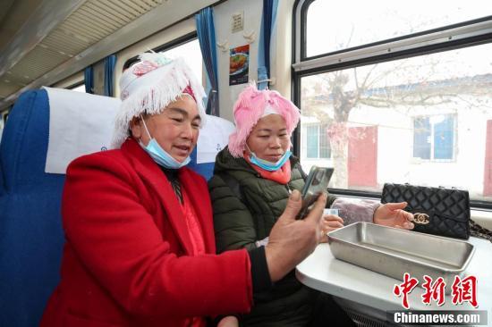 1月17日是2022年春运首日,在贵州省铜仁市玉屏县开往贵阳市的5639次普速列车上,沿线16个站点的山区民众选择乘坐5639次列车前往县城和市区赶集买卖、走亲探友。图为在玉屏县开往贵阳市的5639次列车上,两位旅客在录制短视频。瞿宏伦 摄