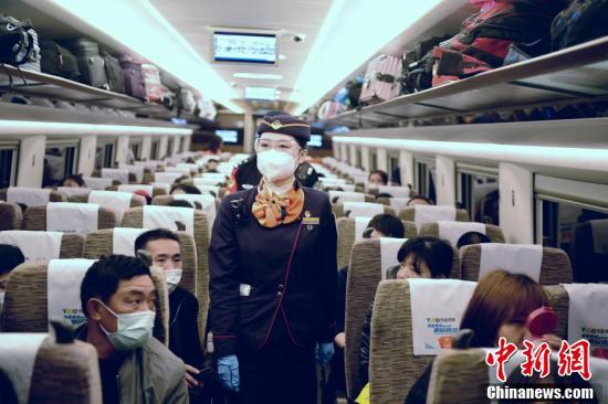 1月17日,2022年春运大幕开启,在深圳北站开往合肥南站的G636次高铁列车上,深圳铁路公安处乘警支队乘警与列车长格外繁忙,帮助困难旅客乘车,时刻提醒乘客做好安全防疫,一路守护旅客的安全。图为列车长在巡视车厢。 中新社记者 陈文 摄