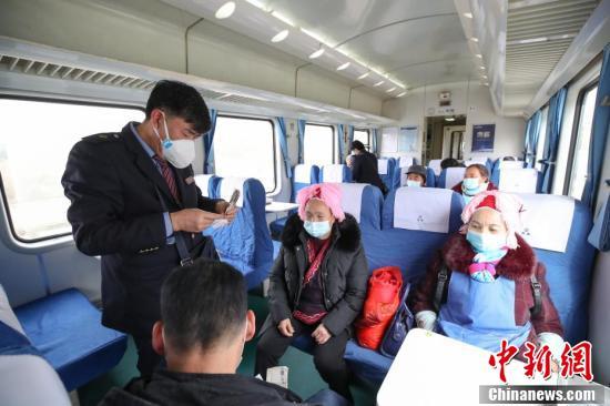 1月17日是2022年春运首日,在贵州省铜仁市玉屏县开往贵阳市的5639次普速列车上,沿线16个站点的山区民众选择乘坐5639次列车前往县城和市区赶集买卖、走亲探友。图为在玉屏县开往贵阳市的5639次列车上,贵阳客运段列车员在售票。瞿宏伦 摄