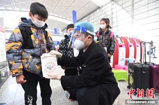 1月17日,国航西南公司工作人员在成都双流机场为无人陪伴儿童办理乘机手续。当日,2022年春运拉开序幕,2月25日结束,共40天。 中新社记者 安源 摄