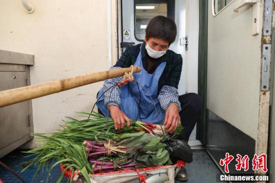 1月17日是2022年春运首日,在贵州省铜仁市玉屏县开往贵阳市的5639次普速列车上,沿线16个站点的山区民众选择乘坐5639次列车前往县城和市区赶集买卖、走亲探友。图为在玉屏县开往贵阳市的5639次列车上,一位农户在整理蔬菜。瞿宏伦 摄