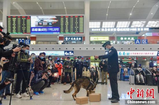 1月17日春运首日,在广西柳州火车站内,柳州铁路公安处民警带着警犬在快递包裹中搜索二手手机和pos机等“电诈”工具,吸引众多旅客的目光。期间,旅客可以和警犬亲密接触,温顺的警犬吸引众多旅客前来“撸狗”。当天,民警通过开展乘车禁限带物品讲解、防电信诈骗等安全宣传,提高旅客群众的防范意识和安全意识,营造温馨和谐的春运氛围,保障旅客平安出行。图为民警苏亚伟带领警犬“辛巴”向旅客表演搜索“电诈”工具。王以照 摄