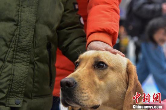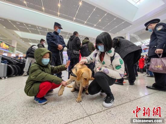 1月17日春运首日,在广西柳州火车站内,柳州铁路公安处民警带着警犬在快递包裹中搜索二手手机和pos机等“电诈”工具,吸引众多旅客的目光。期间,旅客可以和警犬亲密接触,温顺的警犬吸引众多旅客前来“撸狗”。当天,民警通过开展乘车禁限带物品讲解、防电信诈骗等安全宣传,提高旅客群众的防范意识和安全意识,营造温馨和谐的春运氛围,保障旅客平安出行。图为旅客在活动中抚摸警犬。王以照 摄