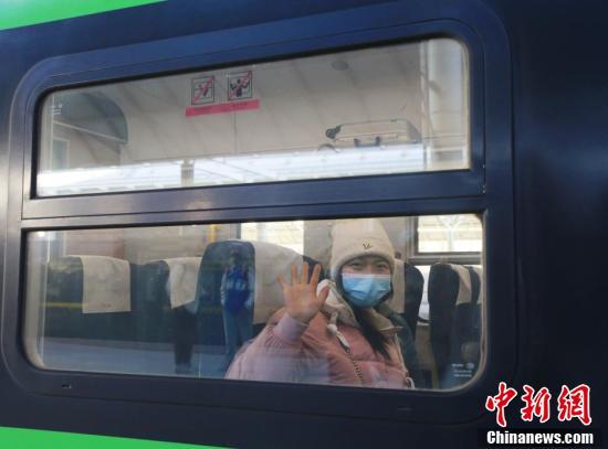 1月17日,在列车上挥手的旅客。当日,2022年春运拉开序幕,2月25日结束,共40天。中新社记者 马铭言 摄