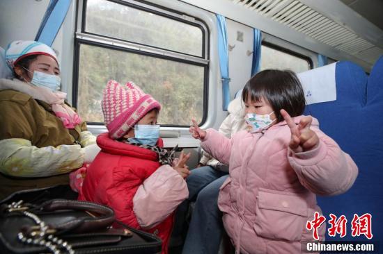 1月17日是2022年春运首日,在贵州省铜仁市玉屏县开往贵阳市的5639次普速列车上,沿线16个站点的山区民众选择乘坐5639次列车前往县城和市区赶集买卖、走亲探友。图为在玉屏县开往贵阳市的5639次列车上,两名小朋友在玩耍。瞿宏伦 摄