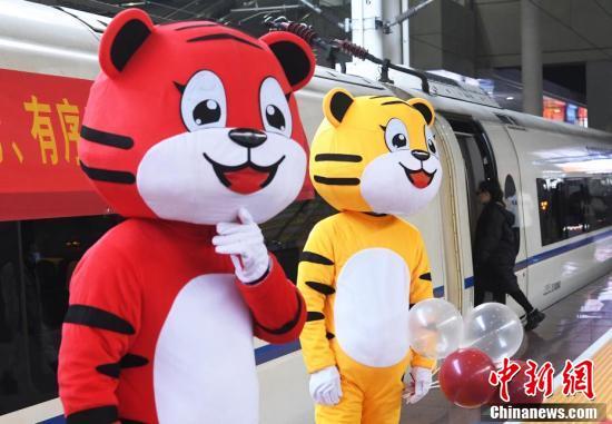 1月17日,重庆客运段列车乘务员身着老虎人偶服迎接旅客。当日,2022年春运拉开序幕,中国铁路成都局集团有限公司重庆客运段、重庆铁路公安处联合在重庆火车北站围绕“平安春运、有序春运、温馨春运,让旅客体验更美好”主题,开展了系列春运活动。陈超 摄