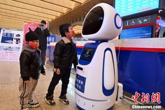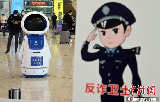 1月17日,2022年春运大幕正式开启,一台呆萌的“安全宣传小卫士”机器人亮相石家庄火车站候车大厅。据介绍,春运期间客流量大,该石家庄市铁路警方使用智能机器人播放防诈安全知识提示旅客。中新社记者 翟羽佳 摄
