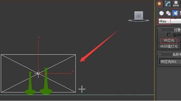 那么这时候我们再找到创建面板,如图打开灯光创建中的VR灯光。这里我们将场景切换到前视图,并创建一个VR灯光。