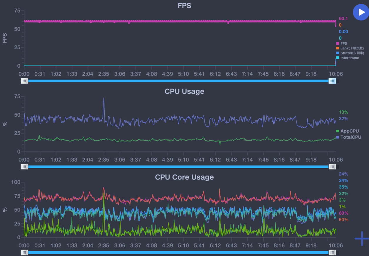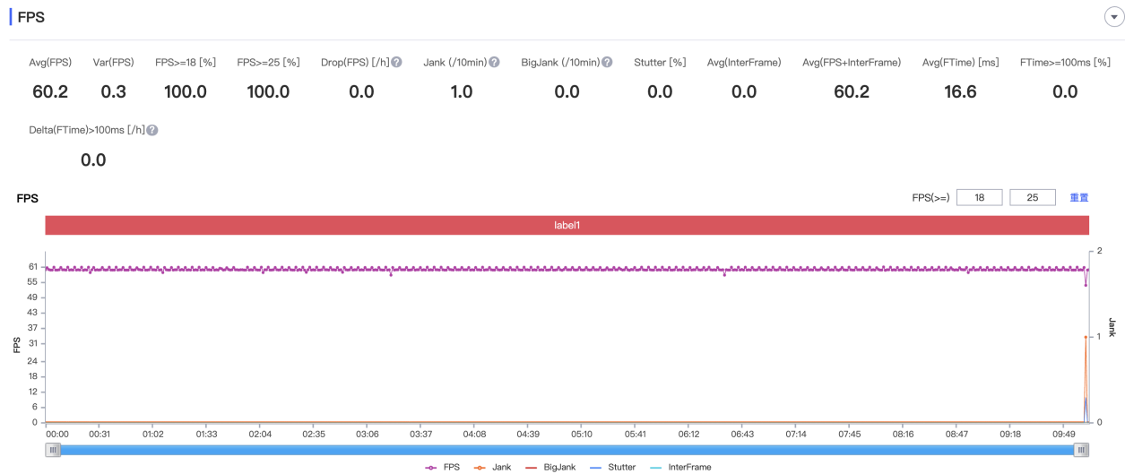 如下图所示,最高画质下,在一局 10 分钟左右的《王者荣耀》游戏中,OPPO A96 的平均帧率为 60.2fps,游戏场景中基本保持稳帧运行,即便是后期团战场景也未出现掉帧现象。