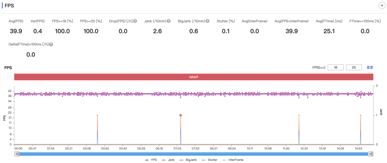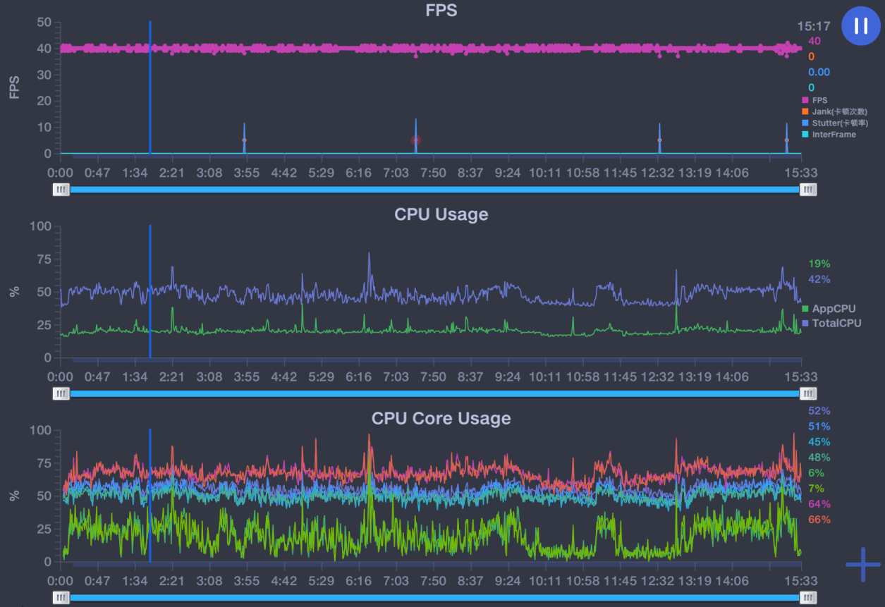 紧接着是对配置略有要求的《和平精英》,在该游戏中,我们选择了流畅画质 + 超高帧率(40 帧),在 15 分钟的游戏中,帧率基本也是区域稳定状态。