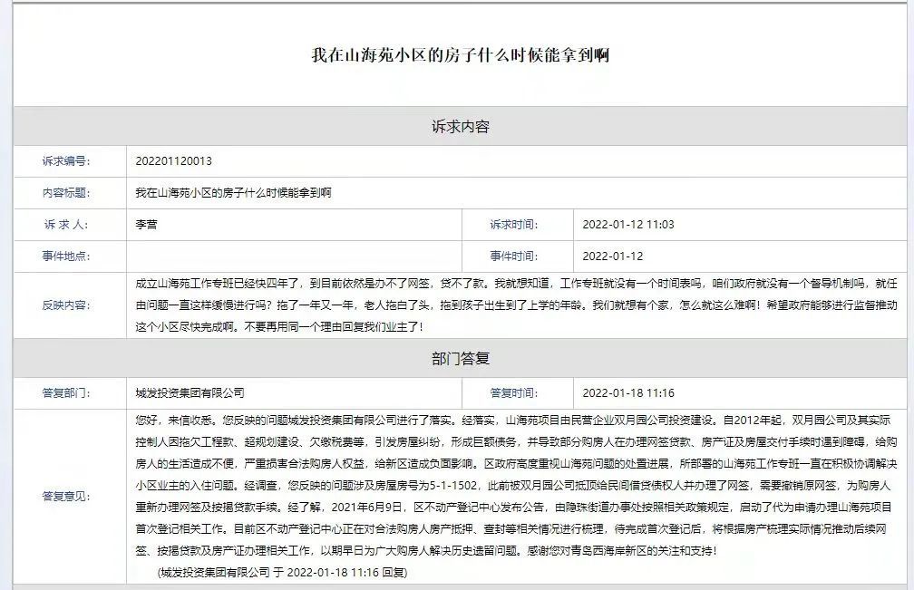 2020年8月,在《问政青岛》“云问政”环节中,有市民反应,自己家住西海岸新区山海苑小区,小区烂尾多年,部分业主好不容易能够住进去,却面临没有燃气和暖气的困境。
