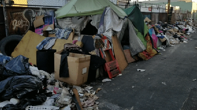 ▲ 在美国洛杉矶市的Skid Row街区,随处可见东倒西歪的帐篷、遍地乱扔的生活垃圾以及大量无家可归者。