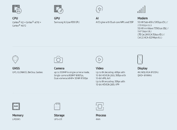 作为首批采用新Armv9 CPU内核的处理器之一,三星Exynos 2200利用Arm的全面计算策略和关键安全功能,提供专门构建的计算和专业处理所需的为未来的移动体验提供动力。并且,Exynos 2200通过升级的NPU提供更强大的设备端人工智能。同时,Exynos 2200还集成了一个快速的3GPP Release 16 5G调制解调器,支持sub-6GHz和毫米波频段。