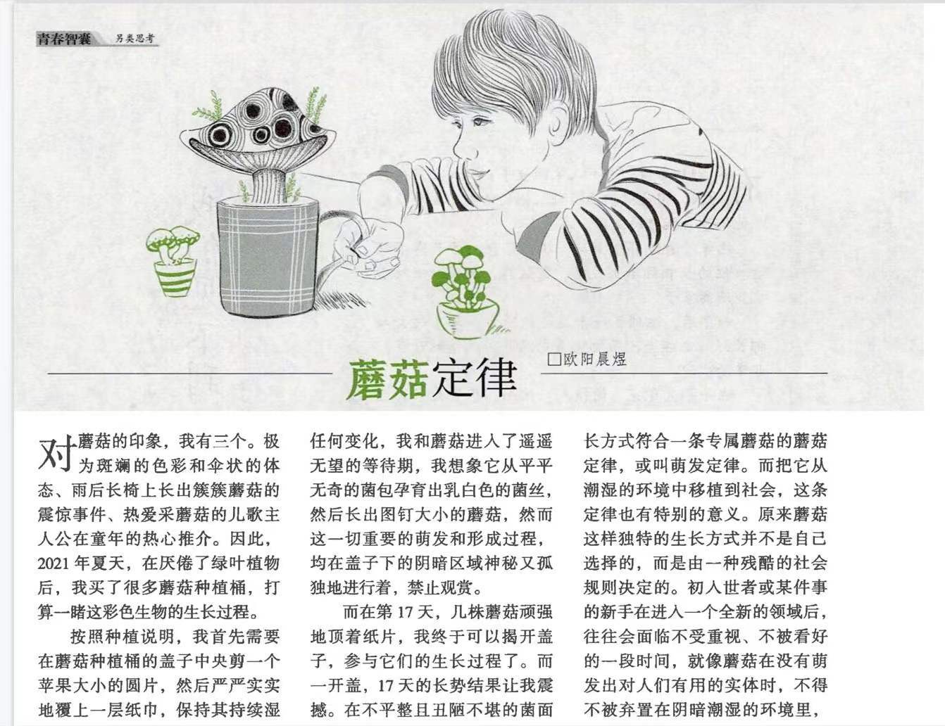 欧阳晨煜:具体来说,大学期间获得了20多项文学赛事的头奖,被编辑认可后成为了一些杂志的长期合作作者,以至后来被各大著名期刊转载。同时也拓展文字能延伸到的领域,成为一些文创产品的作者,之后涉猎了一些新媒体文字部分,现在也在致力儿童文学作品的创作。大概经历的过程是,在赛事里被挖掘,成为纸刊杂志作者,之后拓展各种形式的纸上剧场。我经历的文字的具体形式都不同:从纯文学到文摘,再到新媒体,再回归更纯粹的儿童文学。