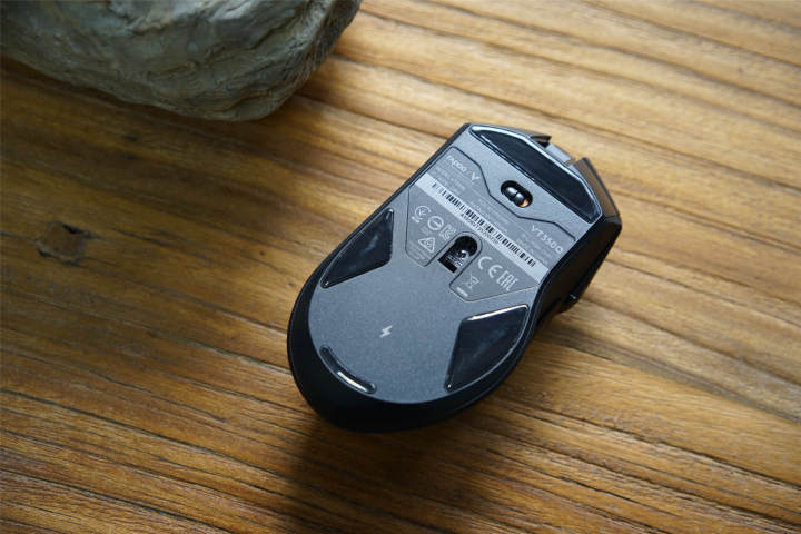除正面及侧面多出的按键外,鼠标背面还有一个实体开关,可以控制鼠标的工作状态。难能可贵的是VT350内置了800毫安时的锂电池,而且可以支持无线充电,续航时间可以达到20小时以上,正常可以使用5至6天,有了V10RGB的无线充电功能,真是绝配的完美组合。
