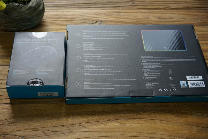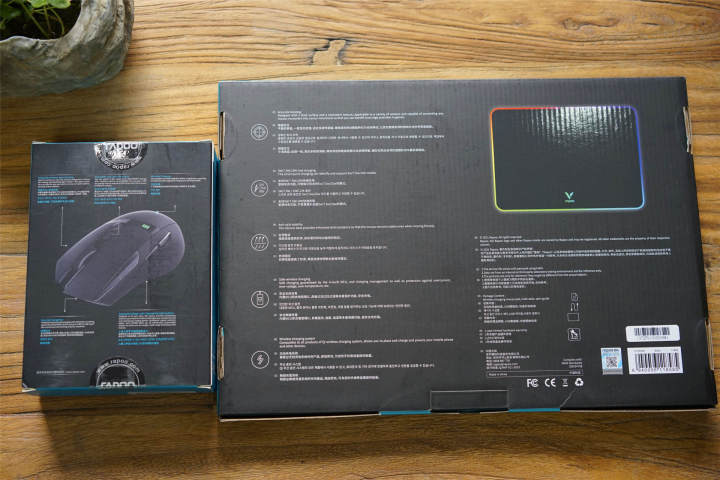 从包装盒上标注的信息可以看出,雷柏VT350无线鼠标主要特性是:板载内存即存即用、实时可调节DPI按键、无线充电、准确定位、人体工学多编程按键设计;而V10RGB 无线充电鼠标垫的主要特性是:精准定位、支持5W/7.5W/10W快速无线充电、防滑稳定、安全无线充电等。