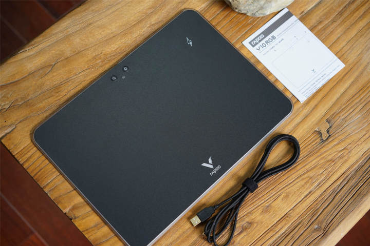 V10RGB鼠标垫灯光部分主要集中在周边一圈地,还有正面底部的品牌LOGO,亮度可以通过电源键分四档调节,当然不喜欢“光污染”的用户也可以将灯光关闭。