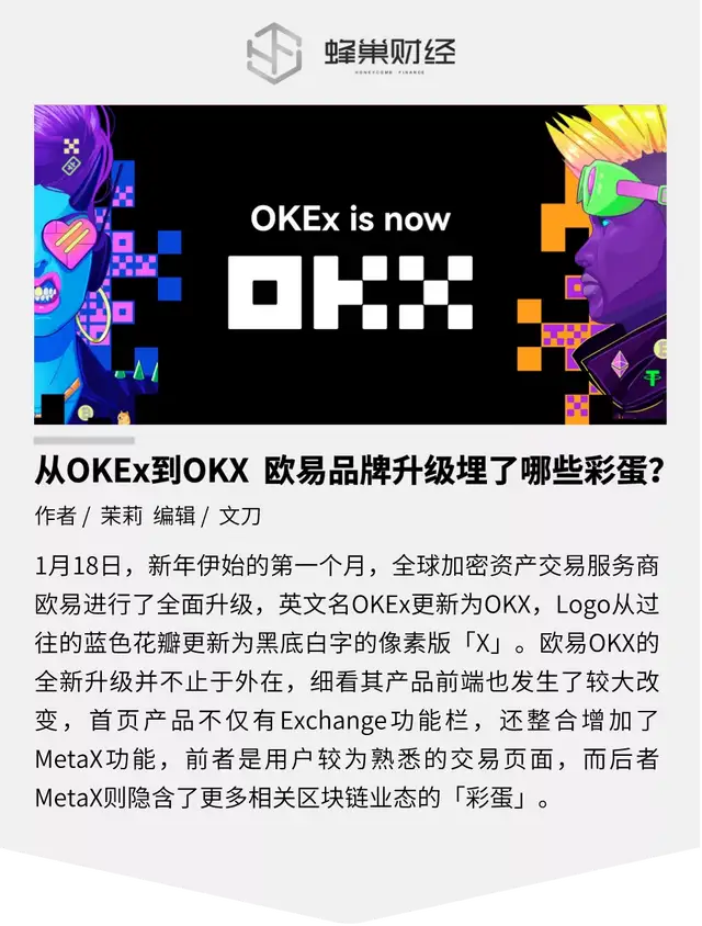 1月18日,新年伊始的第一个月,全球加密资产交易服务商欧易进行了全面升级,英文名OKEx更新为OKX,Logo从过往的蓝色花瓣更新为黑底白字的像素版「X」。