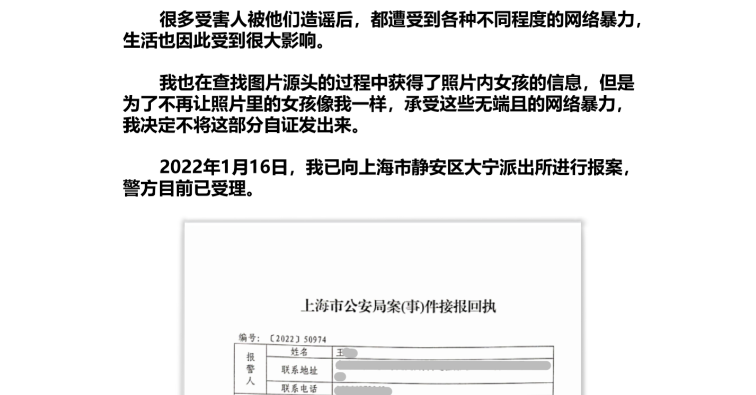 王羽杉在经历了长达一年多的网暴后,近期她在微博中再次发布了澄清该事件的声明,并于2022年1月16日向上海静安区大宁派出所进行了报案,目前该案件正在受理中。很多网友都比较疑惑,为何时隔这么久才报警?首先是因为王羽杉之前多次发布声明无果,网络上有关她的内容下面依旧充斥着恶毒言论。同时她之前并没有找到这些色情内容的源头,而现在找到了源头,有了足够的证据,这才选择报警。