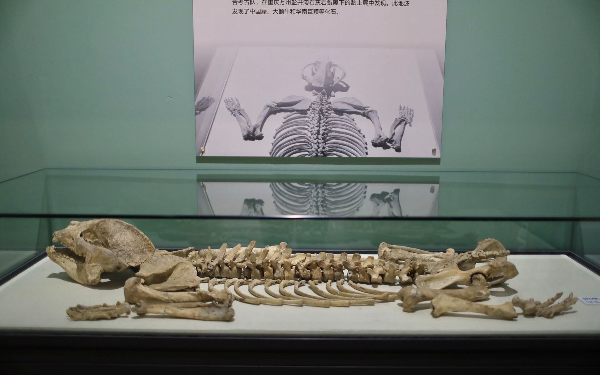 展厅里最重要的标本是位于展柜里的“大熊猫亚化石”。“化石的发现人是黄万波研究员,这个头骨有6000多年的历史了。”苗雨雁介绍,令人惊奇的是,头骨上有明显的刀砍痕迹,证明6000多年前的三峡腹地是大熊猫的家园,也说明大熊猫是史前人类的狩猎对象。