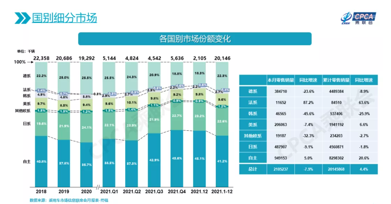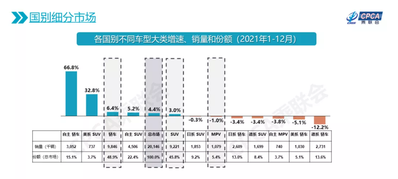 那么日系品牌真就这样势不可挡了吗?并不是的,让我们再来看乘联会发布的各国别不同车型大类增速、销量和份额数据,可以明显看出2021年日系车不论是在SUV,还是轿车领域,都出现了不同程度的销量下滑,其中日系SUV的销量增长速度为-0.3%,日系轿车销量增速为-3.4%,这样齐头并退的局面对于日系品牌来说可以说是十分罕见了,再对比自主品牌车型的突飞猛进,日系车的表现显然是差强人意的。