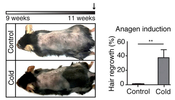 最终结果显示,长期处于低温状态下,交感神经活跃性更高,可加速激活毛囊干细胞,促进新毛发的生长。[2]