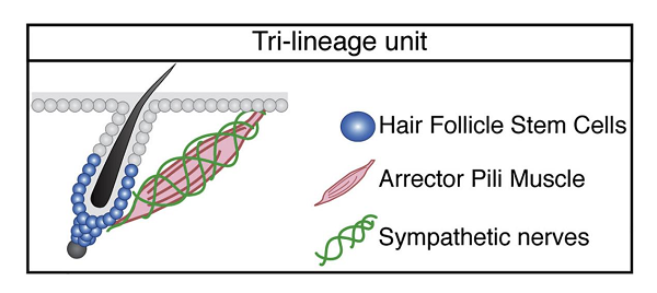 研究人员发现鸡皮疙瘩的出现需要毛囊干细胞、竖毛肌和交感神经的协同作用,毛发的生长也是类似的机制。交感神经分泌去甲肾上腺素调节毛囊干细胞活性,而竖毛肌维持交感神经和毛囊干细胞的相互作用。
