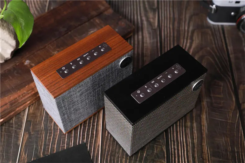 这款蓝牙音响的外观非常小巧精致,木质箱体,金属按钮,大大的圆形手写logo一股轻奢的中世纪设计风格,放在家里,作为摆件也是很不错。