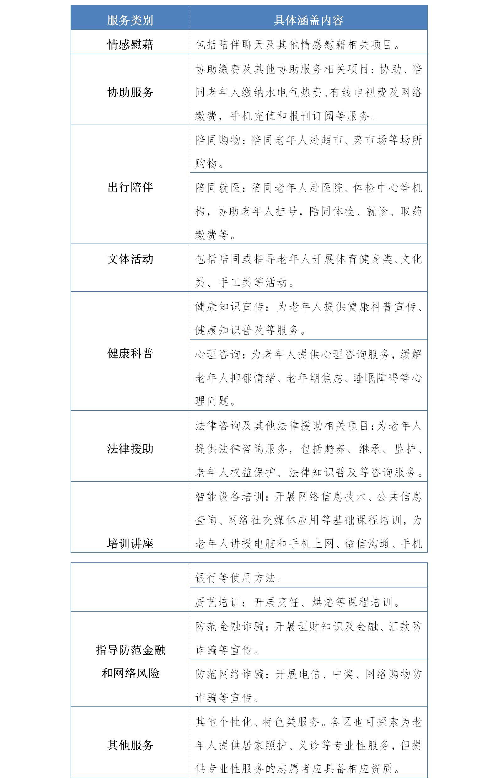 养老服务时间银行的服务内容,包括情感慰藉、协助服务、出行陪伴、文体活动、健康科普、法律援助、培训讲座、指导防范金融和网络风险等八大类服务,基本符合北京市老年群体的普适性需求。