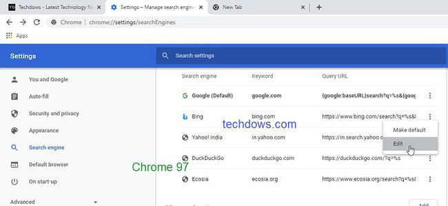 最近更新到 Chrome 97 的小伙伴可能已经注意到,浏览器中存在的谷歌、必应、雅虎、DuckDuckGo 和 Ecosia 等搜索引擎默认不能删除。如上图所示,点击“三点”菜单图标后,只能看到“设为默认”和“编辑”两个选项。