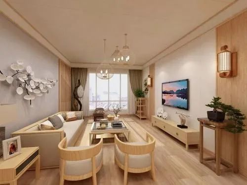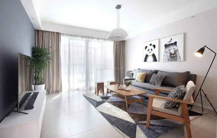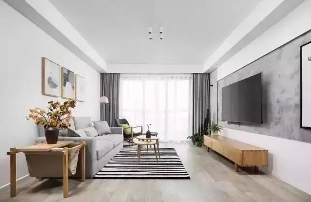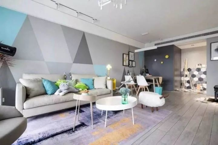4、搭配米白色的沙发,有一种设计的精致感。浅灰色的墙面也不一定要是纯色,简单做点几何图形的花纹,让空间更有延伸感。