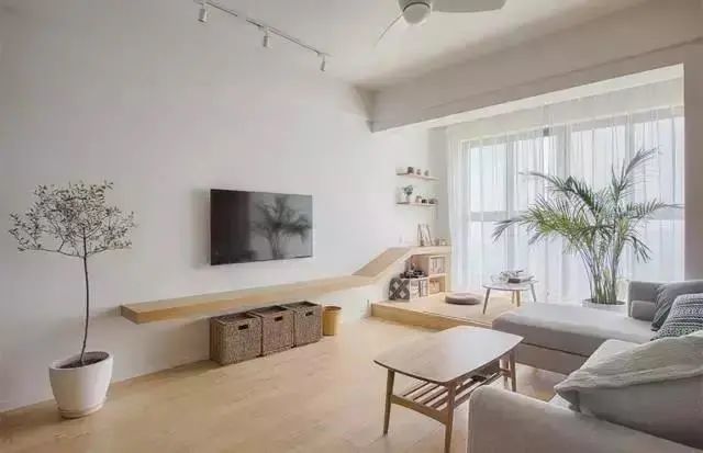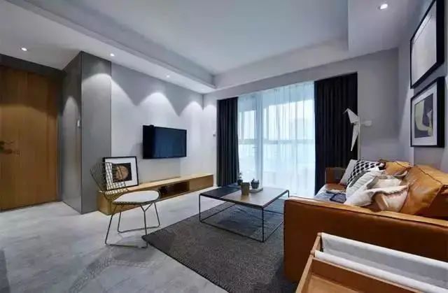 1、浅灰色的墙面,可以搭配深一个灰调的沙发,在电视背景墙中同时加入灰色调,再搭配原木色的家居,客厅环境更显层次。