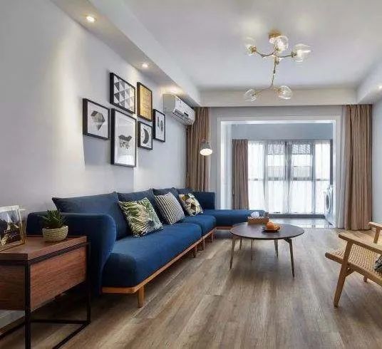 3、灰色的墙面搭配深色系的沙发,类似深蓝调调的。
