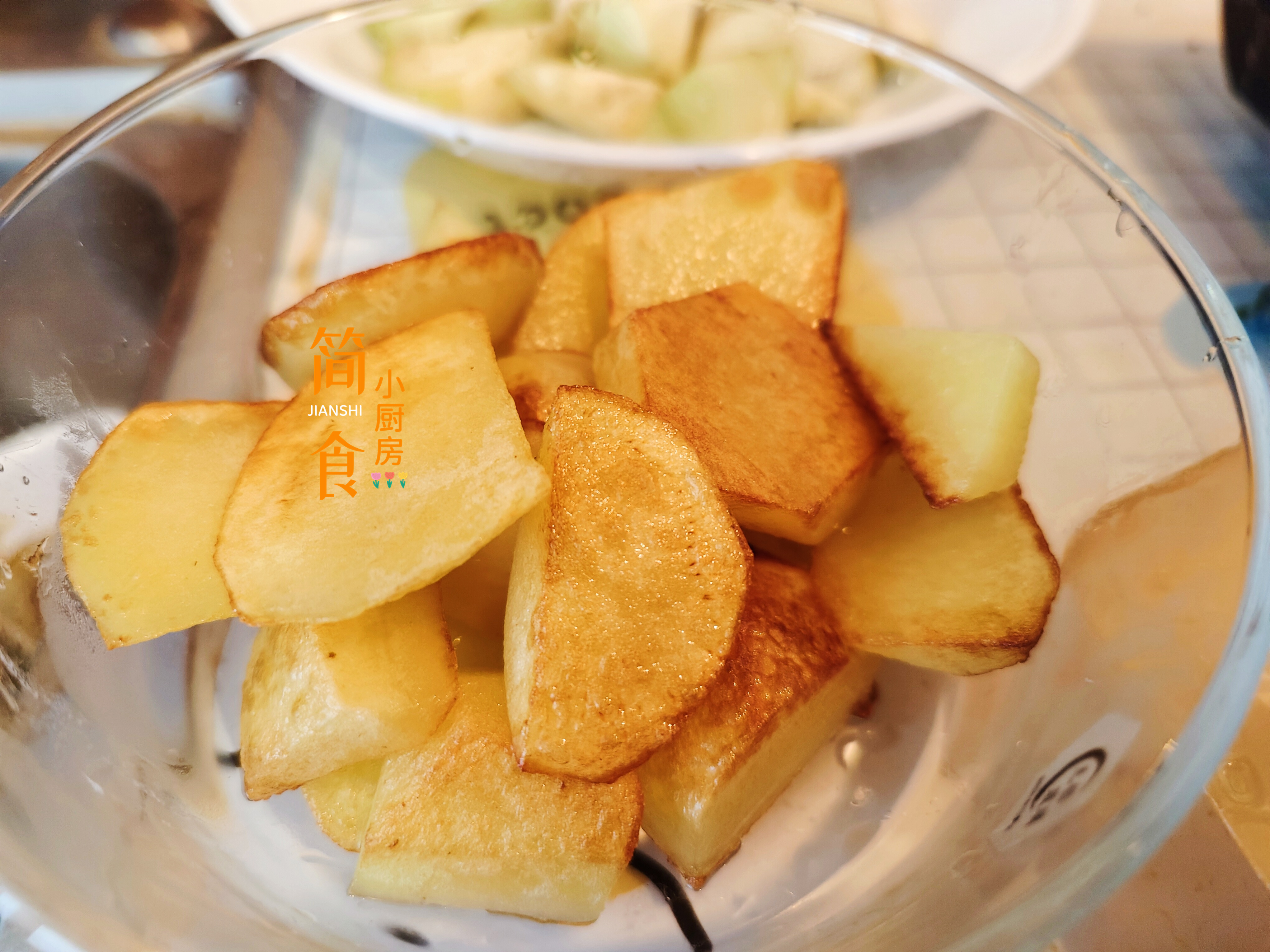 3、锅中放入适量食用油,先将土豆块凉油下锅,平摊开,煎至土豆块边缘微微透明再煎制另一面,至两面微黄、结痂出锅备用。