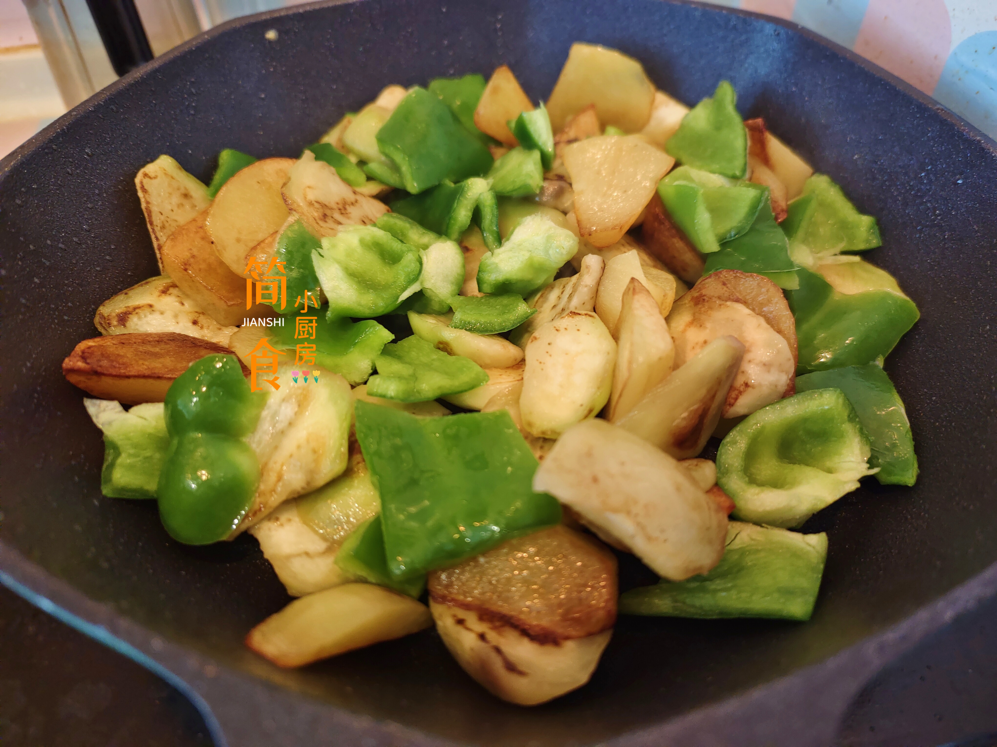 4、这时的茄子表面已经腌出了一层水分,用厨房纸巾吸去表面的水分;锅中留油,保持油温持续六成热,倒入茄子,慢慢煎至两面金黄,均匀上色;然后倒入煎好的土豆块,翻炒几下加热,再放入青椒块,炒至微微变色即可,炒好后倒出控油。