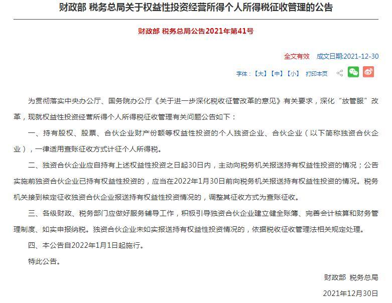 2021年12月30日,财政部、税务总局公告2021年第41号《关于权益性投资经营所得个人所得税征收管理的公告》规定: