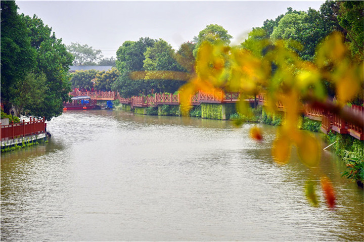 河涌两岸,柳柳轻飘,柳枝发芽,沐浴着春晨的曙光,在春风中摇弋、轻摆,仿佛少女的轻歌曼舞,楚楚动人,娉娉婷婷。河涌里的水车轻快地转着,告诉游客春天的信息,唱着清脆悦耳的歌。