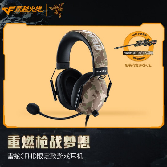 雷蛇 CFHD 限定款游戏耳机基于旋风黑鲨 v2 电竞耳机设计,顶部以及外壳采用迷彩图案。这款耳机采用 50mm 镀钛动圈单元,封闭式设计,有效隔绝噪音。产品搭载灵晰降噪麦克风,支持 THX 空间音效,侧面还具备实体音量旋钮。